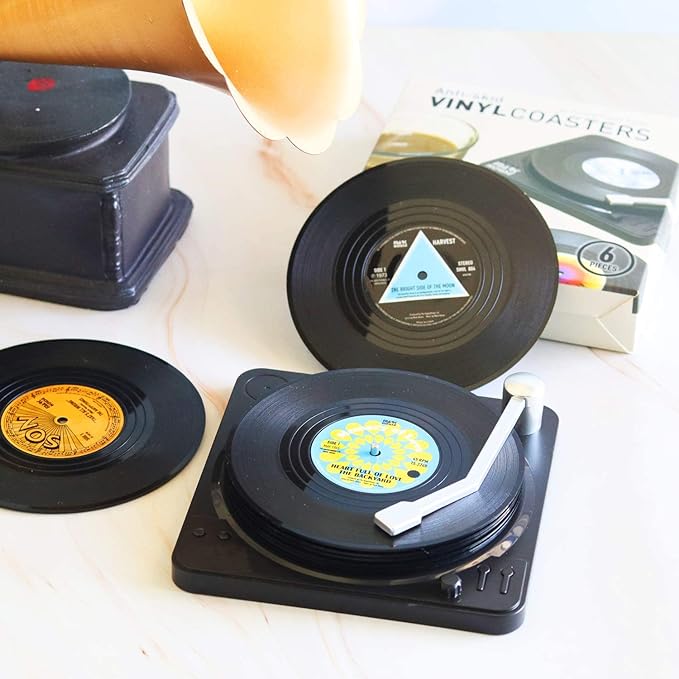 Adorn your coffee table with these stylish retro vinyl record coasters, making them perfect for music lovers, perfect decoration for 80s.